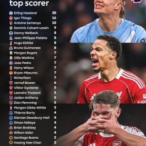 1月24日讯 英超官方列本赛季各队联赛射手王,曼城哈兰德、切尔西若昂·佩德罗、曼联姆伯莫、阿森纳约克雷斯+特罗萨德、利物...