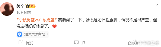 不久前,广东体育频道记者关辛发文报道,徐杰是习惯性崴脚,情况不是很严重,但肯定得好好休息了。