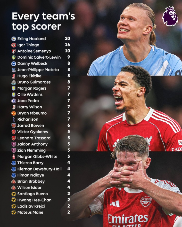 英超各队本赛季联赛射手王:曼城哈兰德20球 阿森纳2人各5球